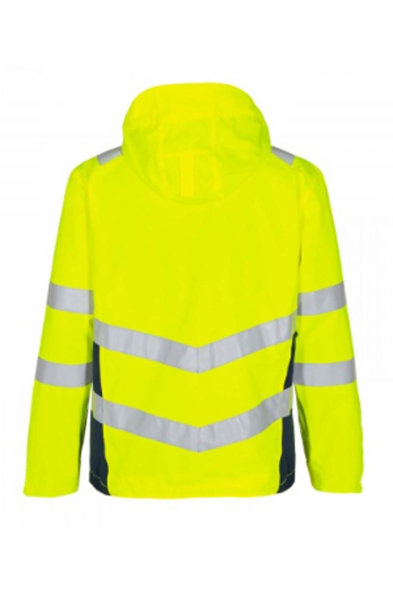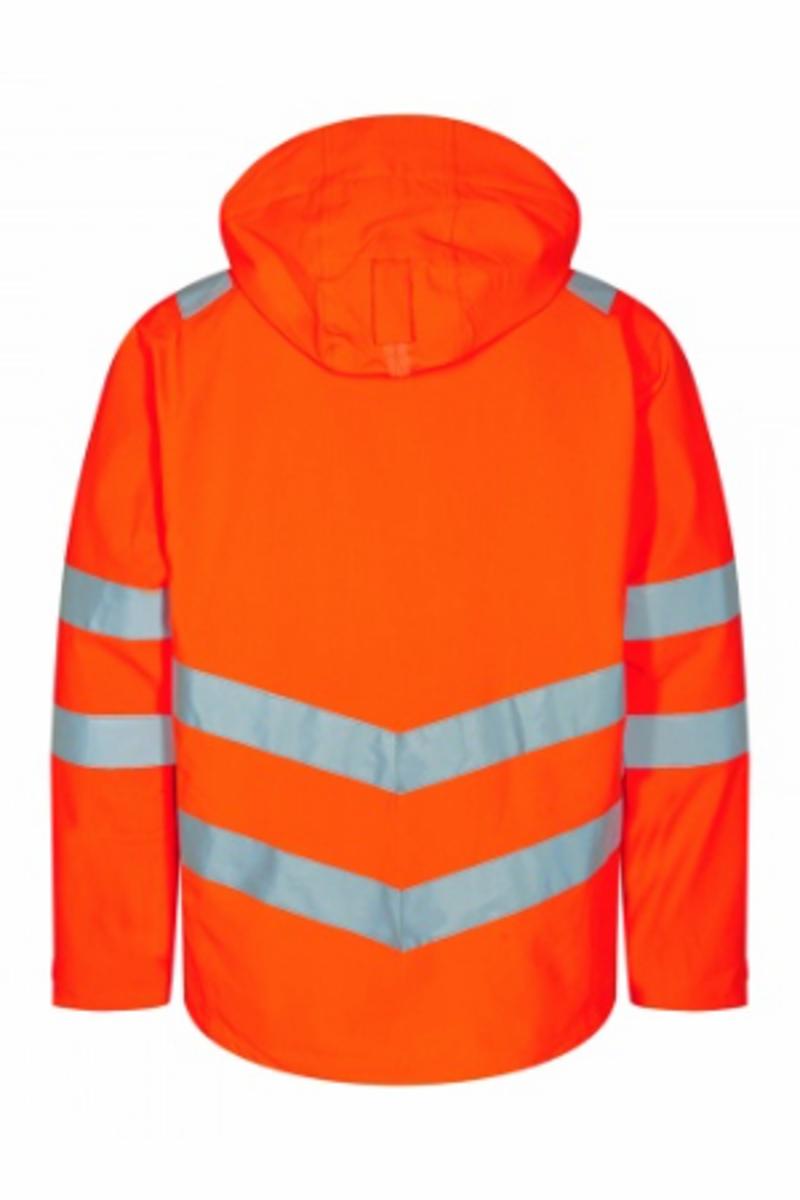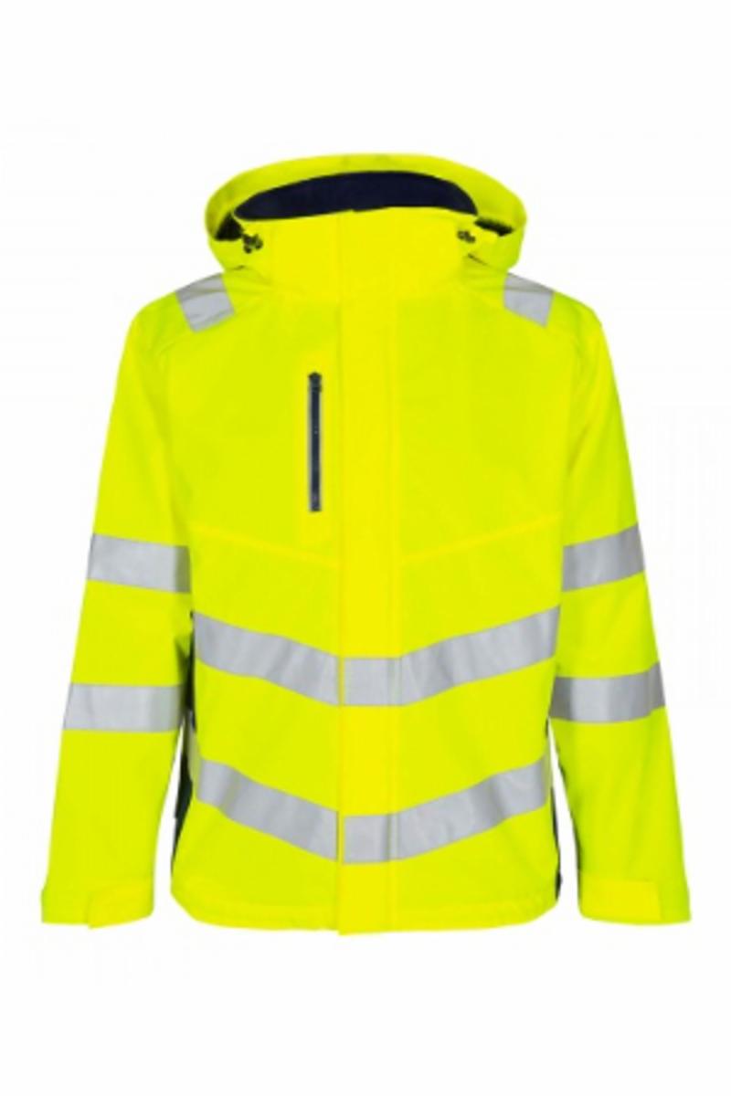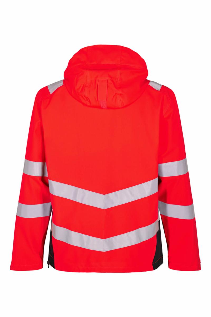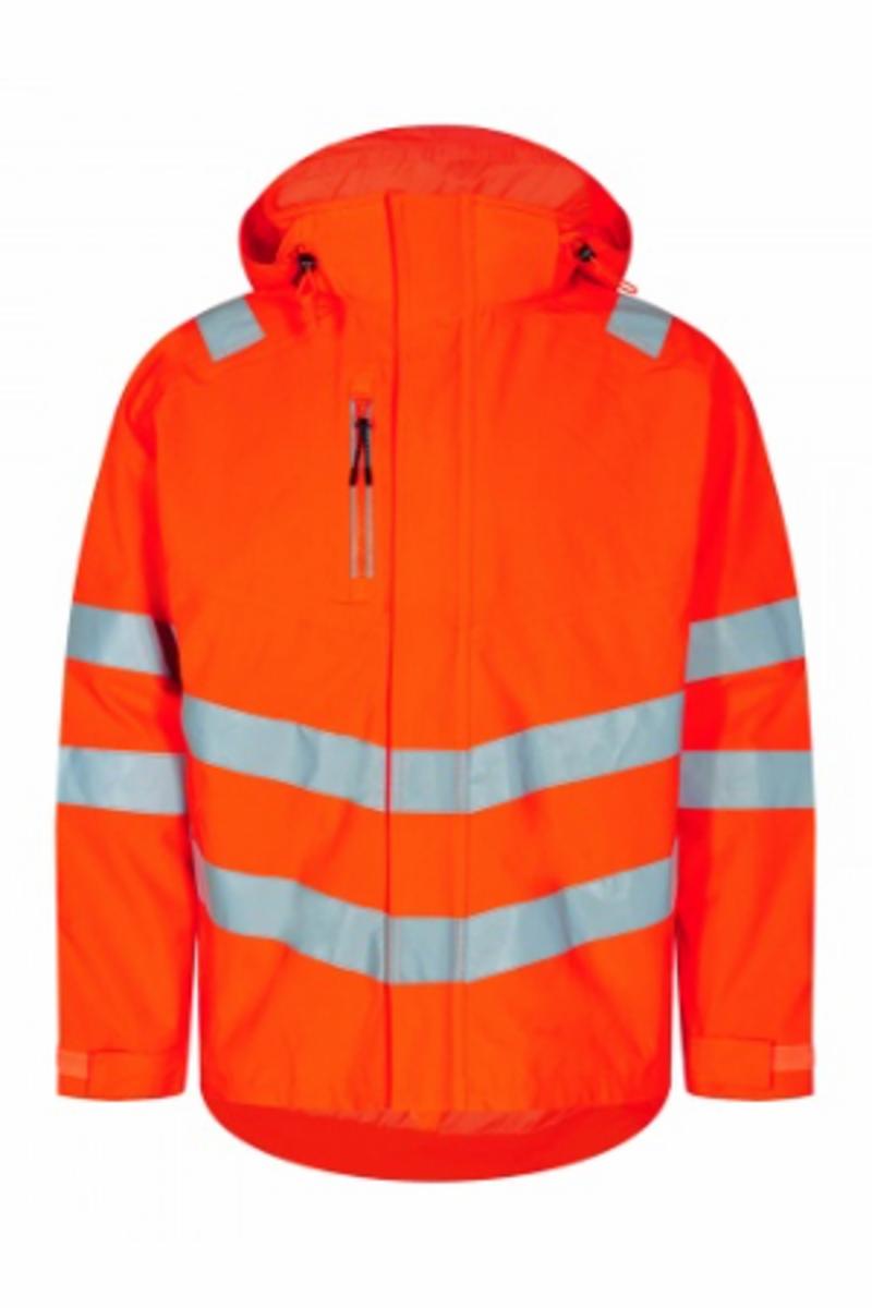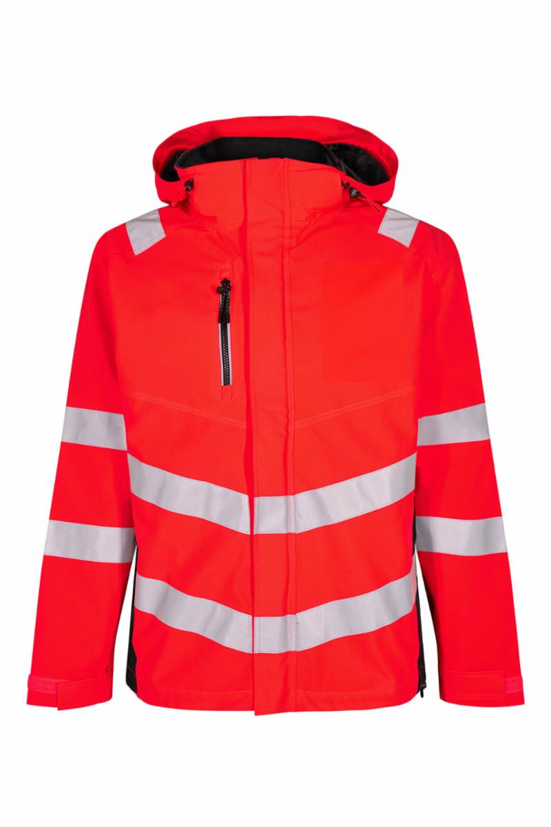 Fluorescerende pustende, vann- og vindtett skalljakke med tapede sømmer og høy hals i moderne snitt. Dobbel stolpelukking med gidelås og borrelås i front. To romslige sidelommer og brystlomme med glidelåslukking, samt store innvendige lommer lukket med borrelås. Avtagbar, regulerbar hette med plass til arbeidshjelm. Regulerbare manchetter. Glidelås i foret for plassering av trykk/broderi. Reflekser over skuldre og rundt ermer og liv.