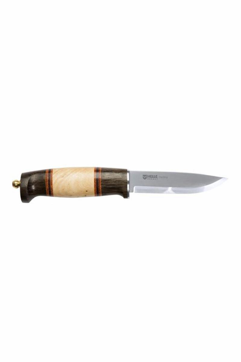 Harding kjem i ei klassisk slire i brunt lær med ein ekstra søm og stropp som låser kniven fast i slira.