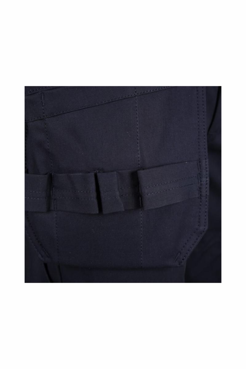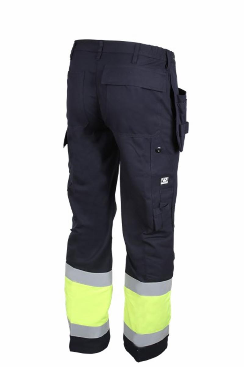 Linning med stikk i midje, beltestropper, plastikknapp, og skjult glidelås fra inn og utsiden i gylf. Buksen har 2 stikklommer, 2 doble hengelommer, høyre lomme med verktøyhemper, 2 baklommer, 1 med klaff, 1 dobbel tommestokklomme med knivsløyfe, 1 lårlomme med mobillomme venstre side, begge lommene under klaff. kneputelommer og 2 refleksbånd rundt ben.