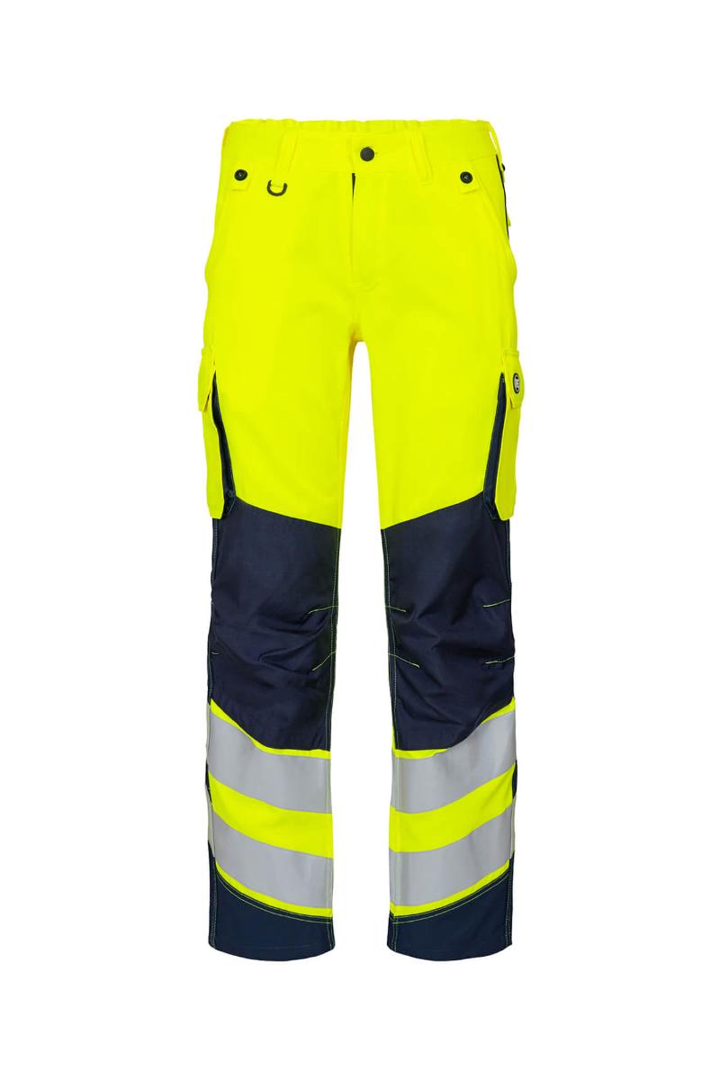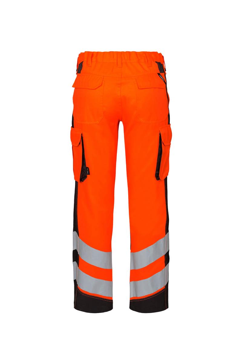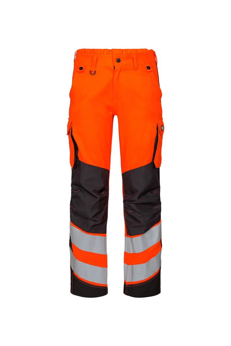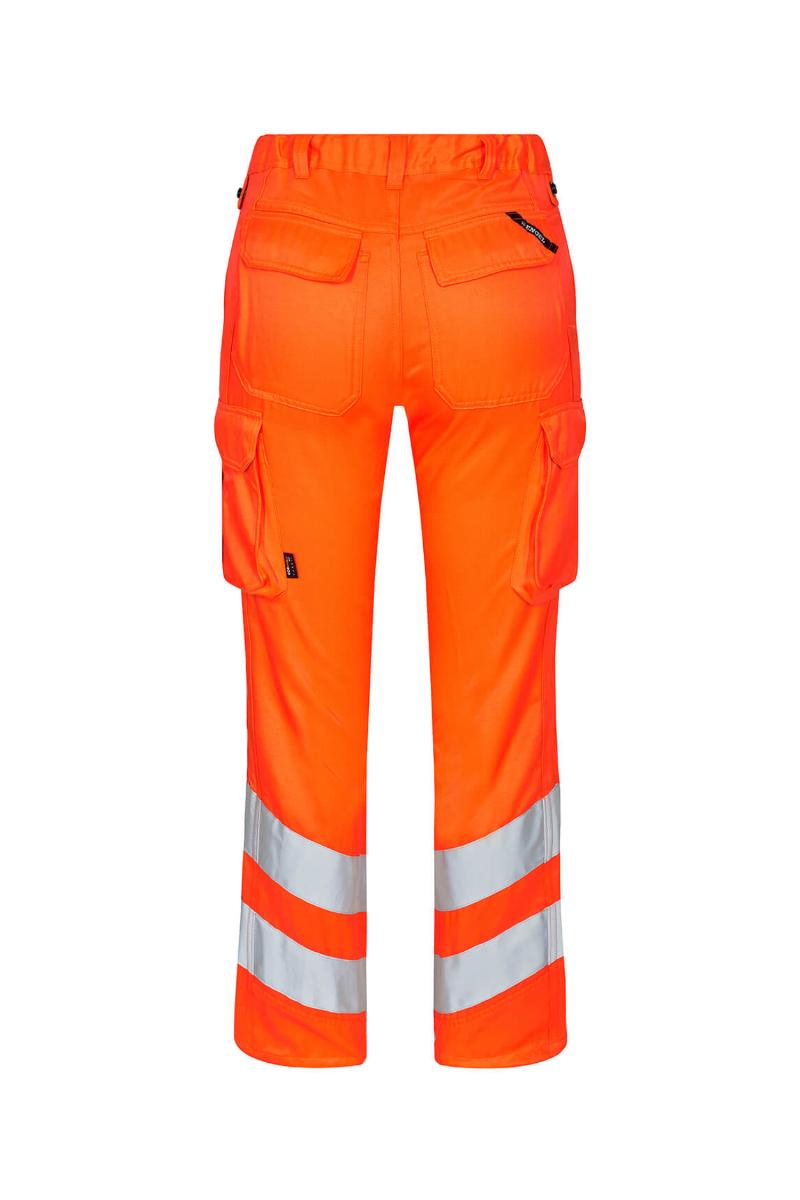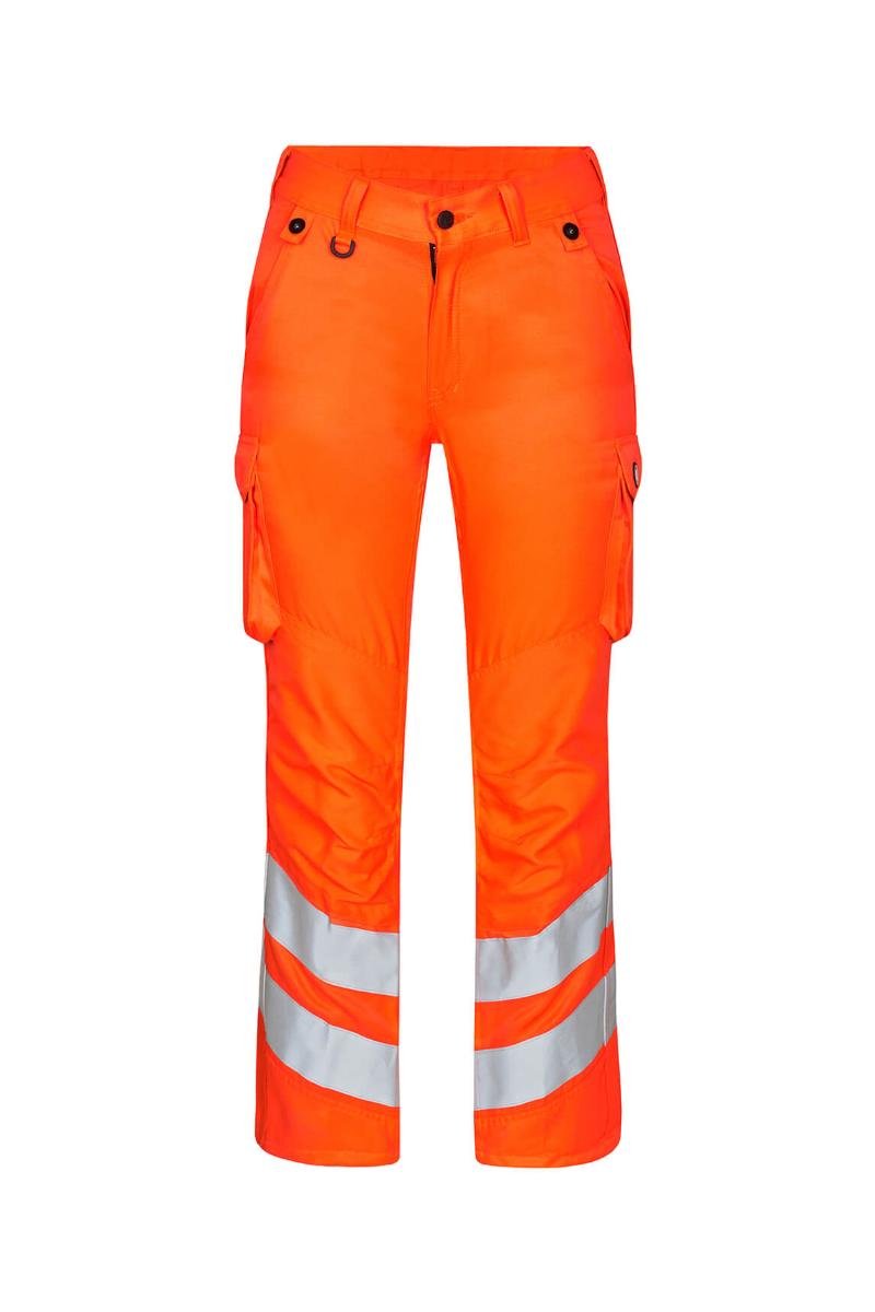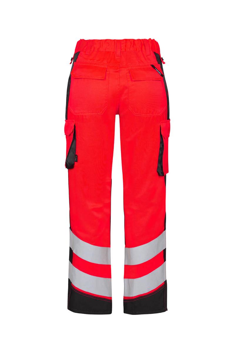 Funksjonelle og bærekraftig fluorescerende bukser, spesialdesignet for kvinner. Optimal passform med bl.a. ergonomisk formet kneparti. Stoffet er slitsterk og pustende og laget av 50% bærekraftig re-generert polyester. Elastikk i midjen bak sikrer god passform og gjør at buksen sitter der den skal ved bevegelse. Knapper for lett og rask montering av hengelommer. D-ring foran til feste av f.eks. ID-kort. To romslige skrålommer foran. To baklommer med klaff og borrelåslukking. To lårlommer som lukkes med borrelås. I venstre side har lårlommen en ekstra telefonlomme samt innvendig lomme til bl.a. walkie-talkie. I høyre side er det en innvendig lomme til oppbevaring av f.eks. meterstokk. Kneforsterkning/knelomme med borrelåslukking nederst og laget i ekstra slitsterkt CORDURA®-materiale. Reflekser rundt leggen. Bekledningsklasse 2.