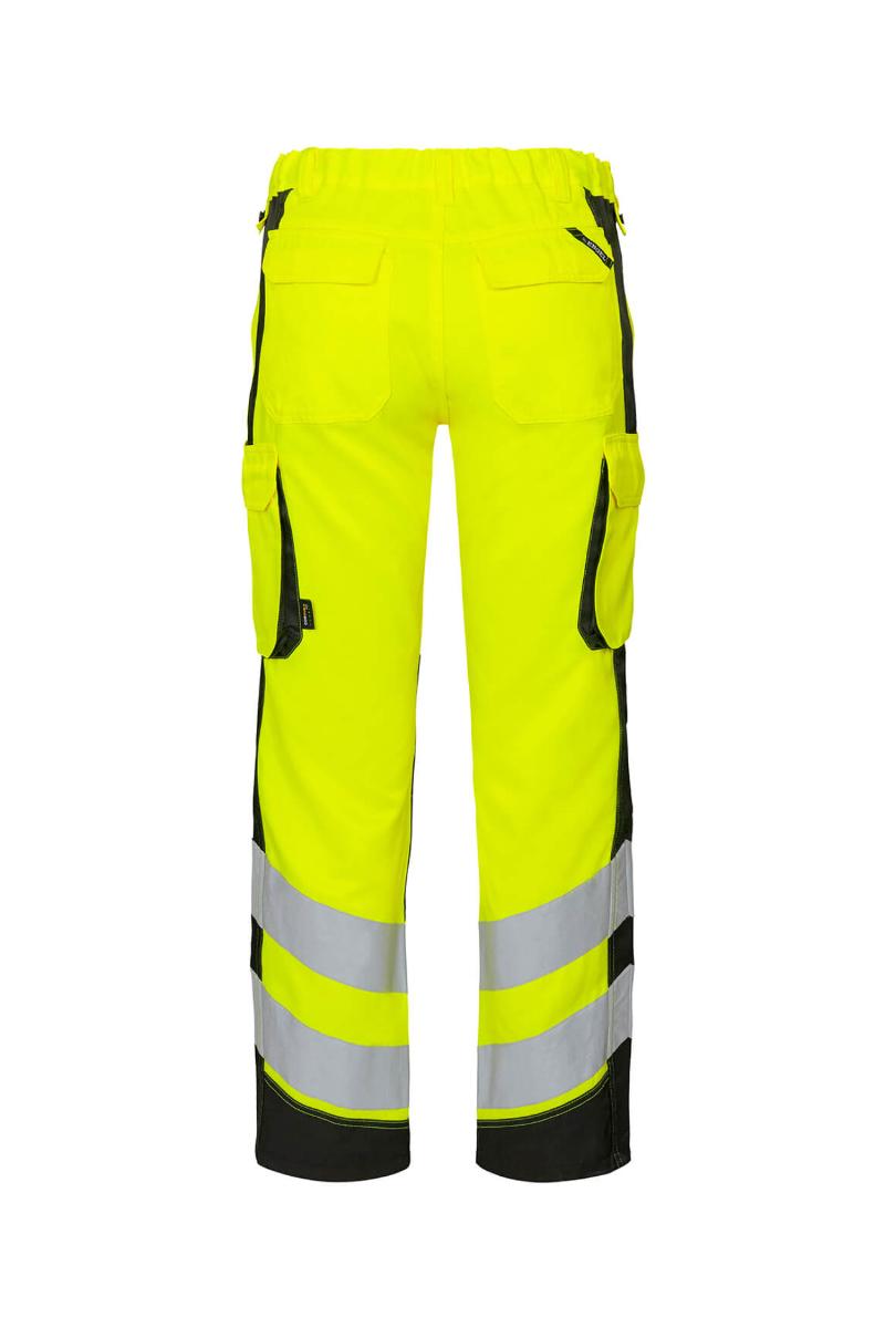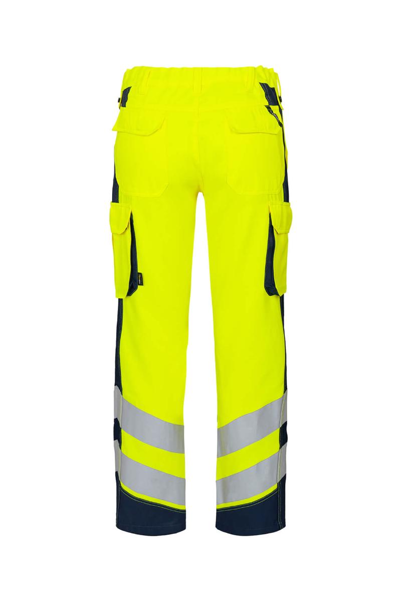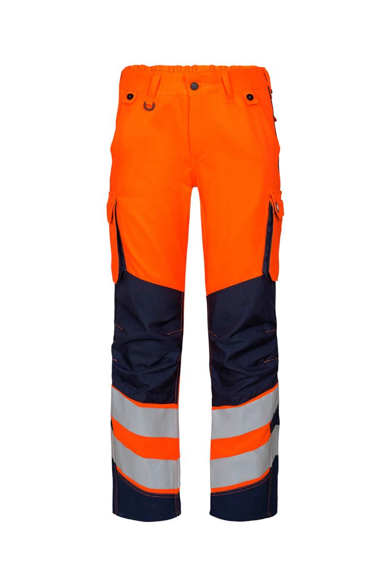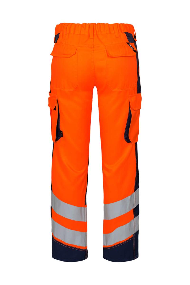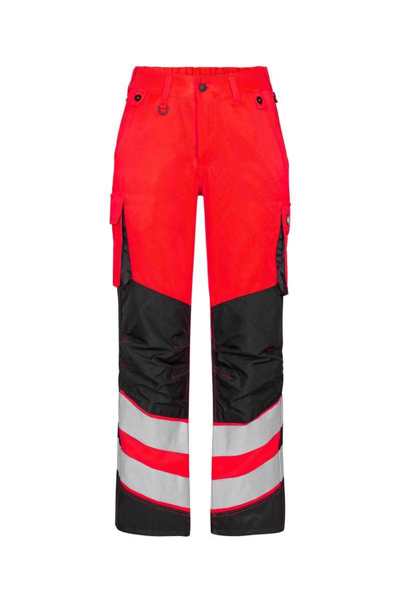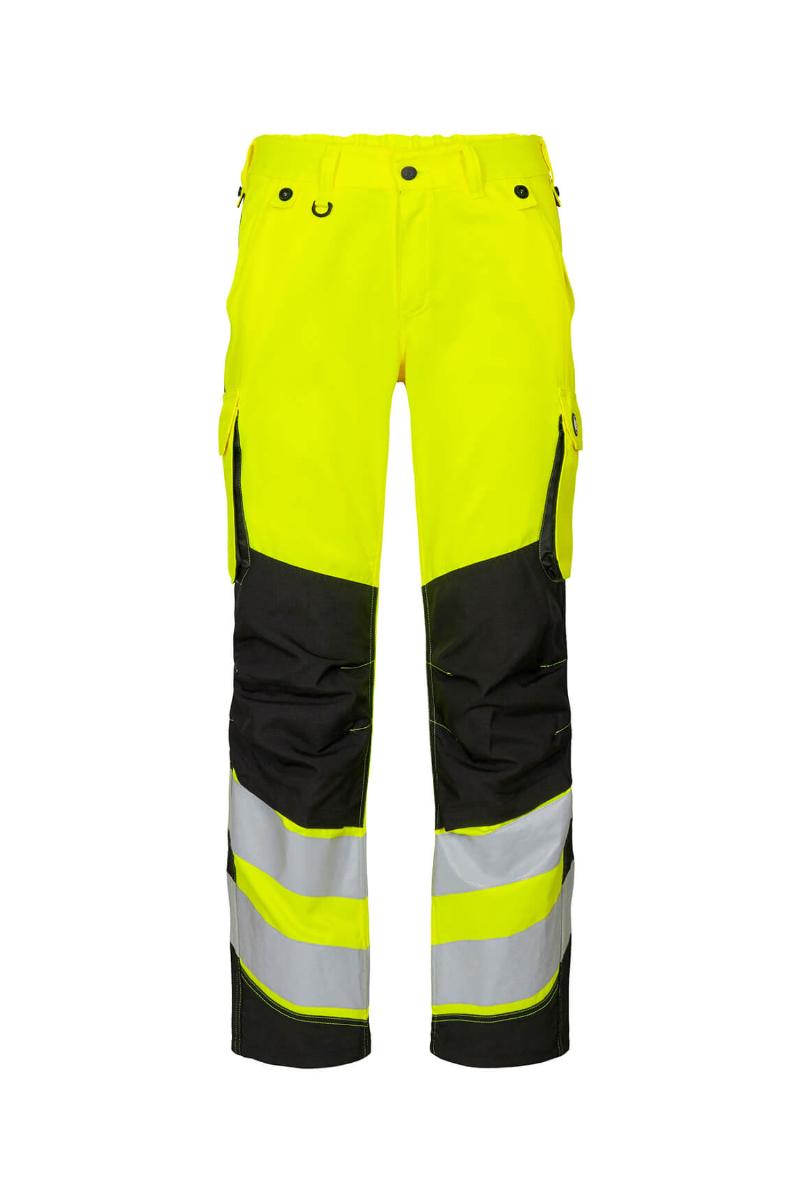 Funksjonelle og bærekraftig fluorescerende bukser, spesialdesignet for kvinner. Optimal passform med bl.a. ergonomisk formet kneparti. Stoffet er slitsterk og pustende og laget av 50% bærekraftig re-generert polyester. Elastikk i midjen bak sikrer god passform og gjør at buksen sitter der den skal ved bevegelse. Knapper for lett og rask montering av hengelommer. D-ring foran til feste av f.eks. ID-kort. To romslige skrålommer foran. To baklommer med klaff og borrelåslukking. To lårlommer som lukkes med borrelås. I venstre side har lårlommen en ekstra telefonlomme samt innvendig lomme til bl.a. walkie-talkie. I høyre side er det en innvendig lomme til oppbevaring av f.eks. meterstokk. Kneforsterkning/knelomme med borrelåslukking nederst og laget i ekstra slitsterkt CORDURA®-materiale. Reflekser rundt leggen. Bekledningsklasse 2.
