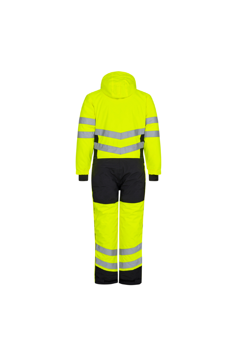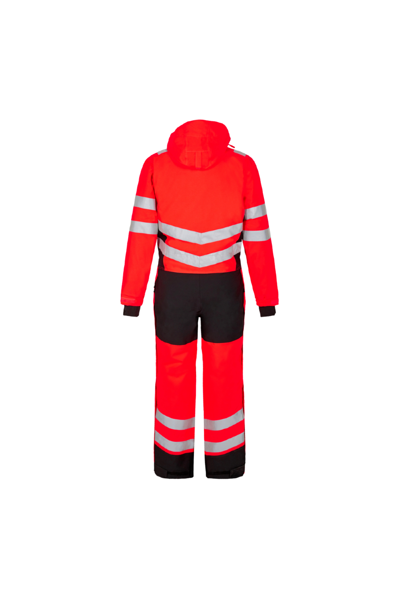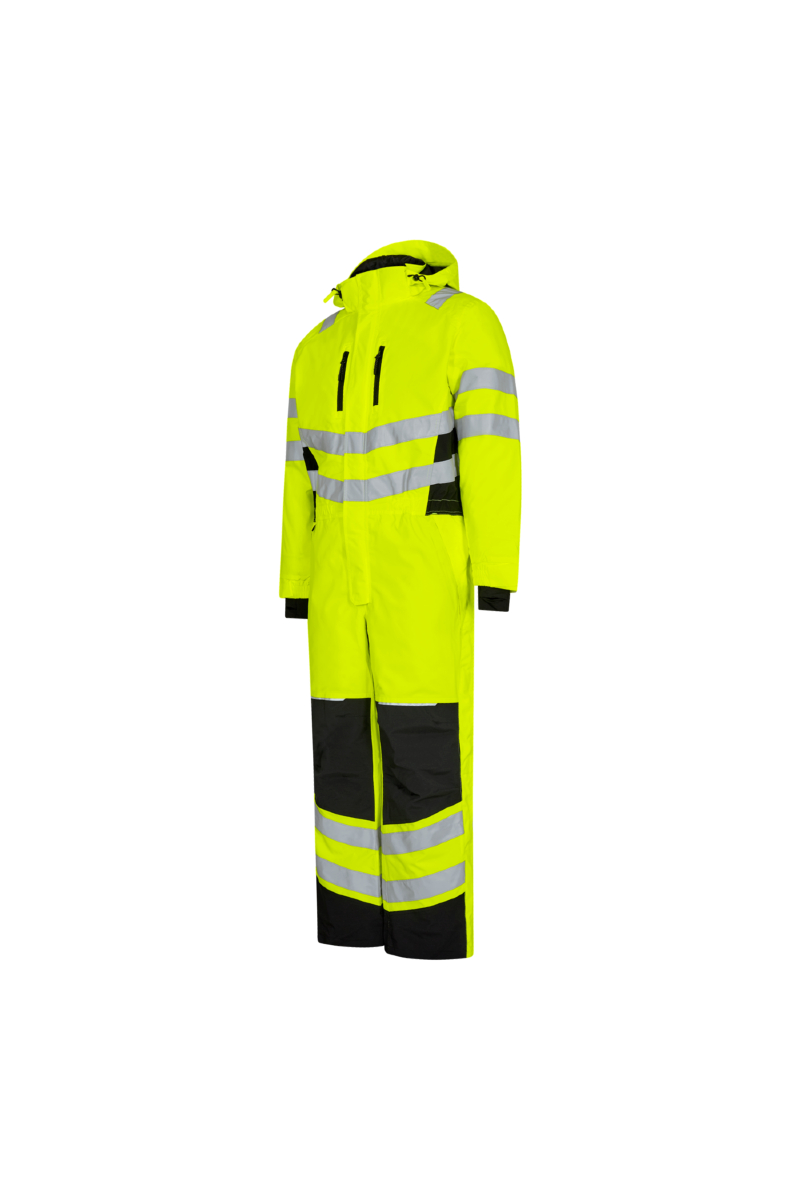 Fluorescerende pustende, vann- og vindtett vinterkjeledress med tapede sømmer og høy hals i moderne snitt. Dobbel stolpelukking med glidelås og borrelås i front. To romslige sidelommer lukket med borrelås. To brystlommer og innvendig telefonlomme, med mulighet for å trekke ledning ut gjennom en åpning, samt glidelåslukking. Avtagbar hette med plass til arbeids hjelm. Ribbedetaljer ved korsryggen som sikrer god passform og bevegelsesfrihet. Kneforsterkning. Regulerbare mansjetter ved ermer og nederst på buksebeina. Glidelås på utsiden av begge beina. Glidelås i for til trykk/broderi. Reflekser over skuldre, rundt ermer, midje og ben. Bekledningsklasse 3. Testet etter 50 ganger vask.