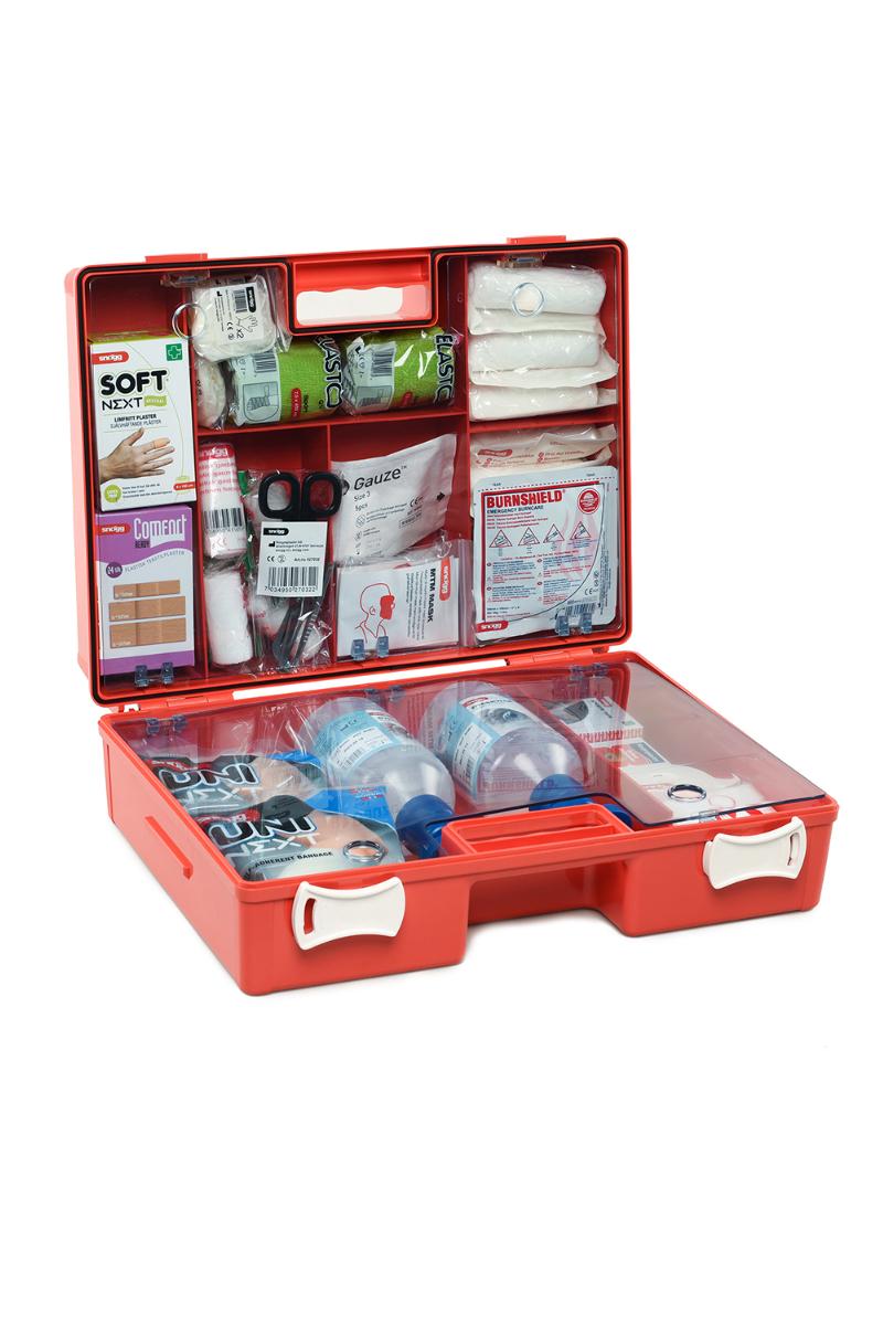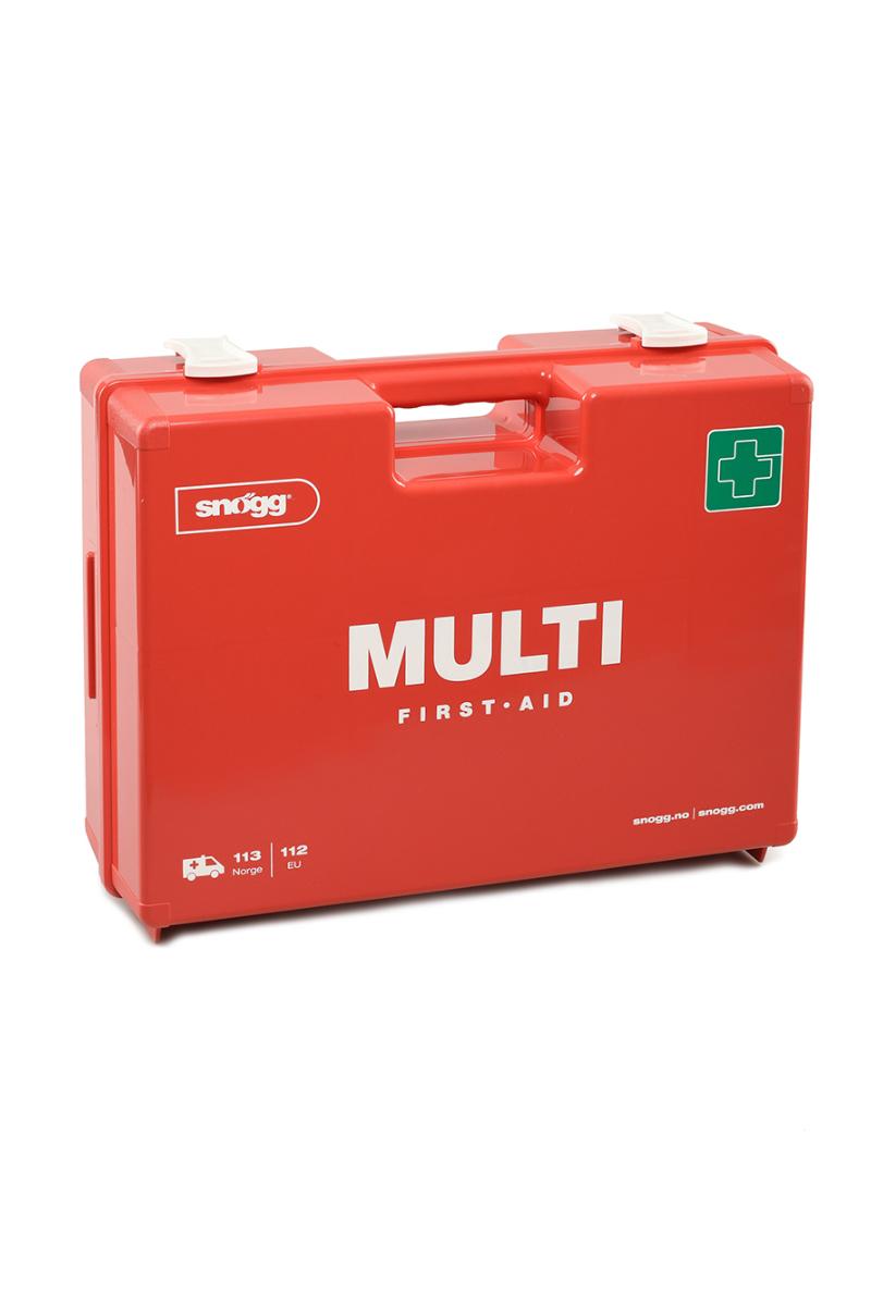 Multi førstehjelpskoffert har et variert og rikt innhold som er beregnet til større ulykker. Innholdet i kofferten er satt sammen iht arbeidstilsyntes anbefalinger. Inneholder blant annet øyeskylle.