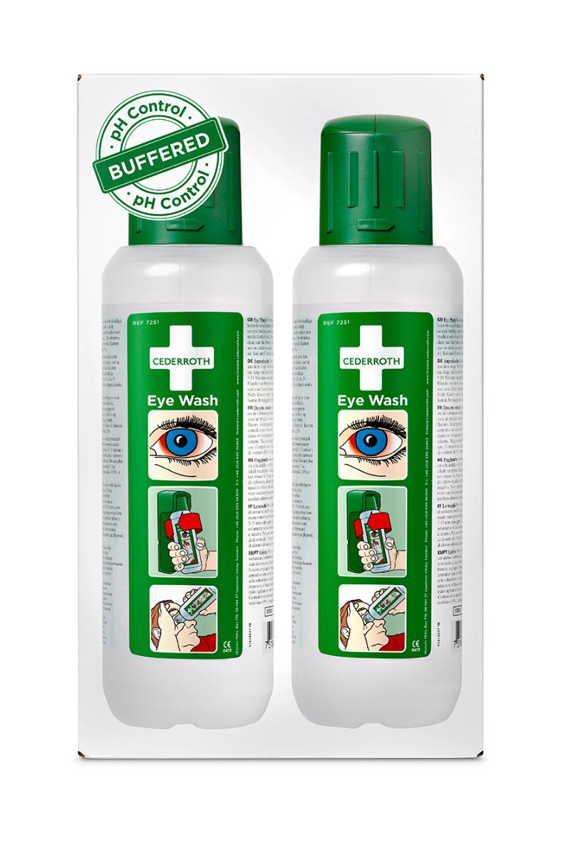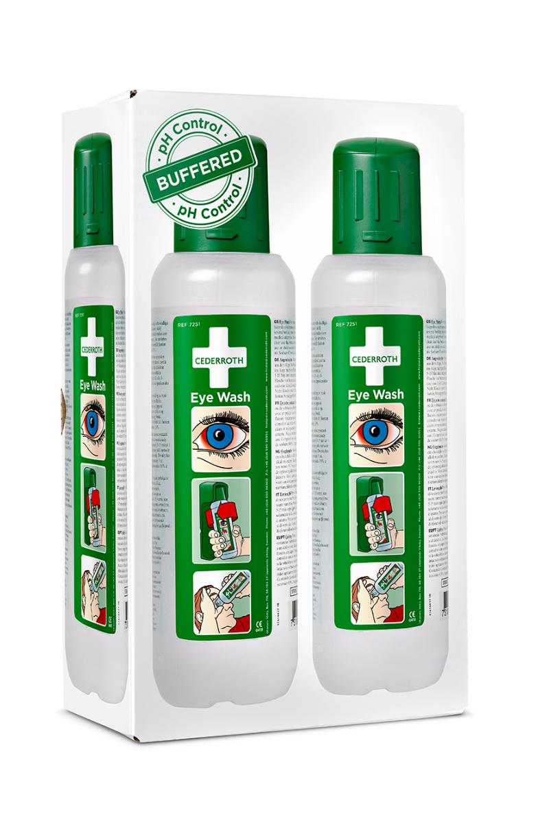 Cederroth øyedusj er en steril, bufret saltløsning med integrert støvbeskytter som holder øyekoppen ren og fin. Støvbeskytteren fungerer samtidig som en åpningsanordning. Flasken åpnes automatisk når den vris ut av veggholderen og må derfor brukes med en gang. Øyekoppen er utformet slik at øyet får rikelig med flyt av væske i ca. 1,5 minutter. Brukes for å skylle bort fremmedlegemer og skadelige stoffer, Cederroths bufrede øyedusj har også en nøytraliserende effekt på sprut av alkalier og syrer. Generelt er effekten sterkere på alkalier enn på syrer