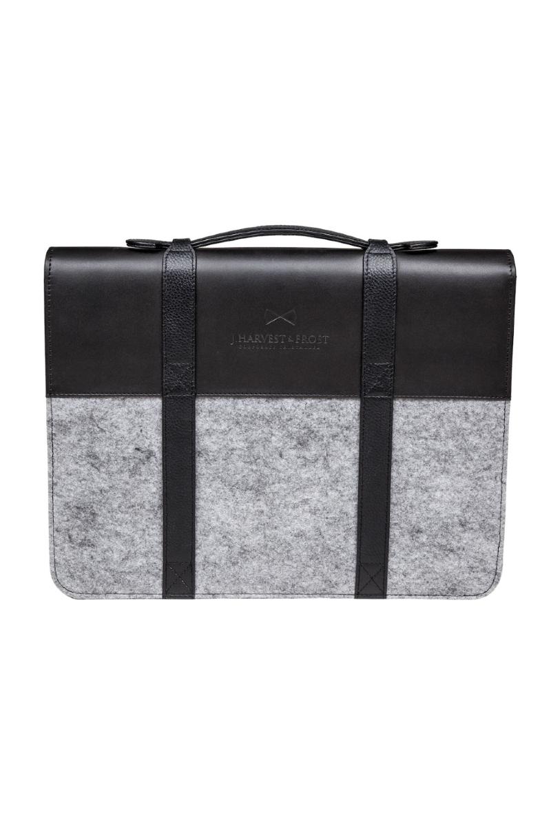 Dokument mappe i en stilig kombinasjon av skinn og filt. Vår elskede J.Harvest & Frost logo er preget pent i skinnet i front, mellom to håndtak i skinn. De er praktisk åpne, slik at du kan plassere din avis der når du er på farten. På innsiden er det fõr i filt og flere åpne lommer. Det er også noen fine kontrastfarger i royal blå i filt i lommene, for å gi den en ekstra tvist.