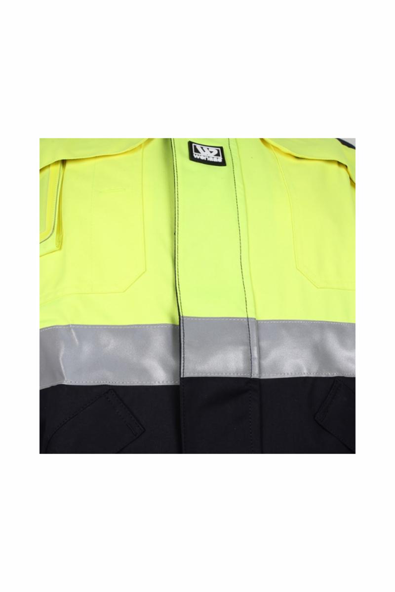 Stående krage, skjult glidelås under stormklaff i front, fold i rygg, og forlenget ryggstykke, erme har splitt og mansjett med regulering, linning med regulering av vidde. Jakken har 2 brystlommer med klaff, mobillomme, ID-kortlomme og blyantlomme. 2 framlommer med glidelås og klaff. Refleks på torso, erme og skuldre.