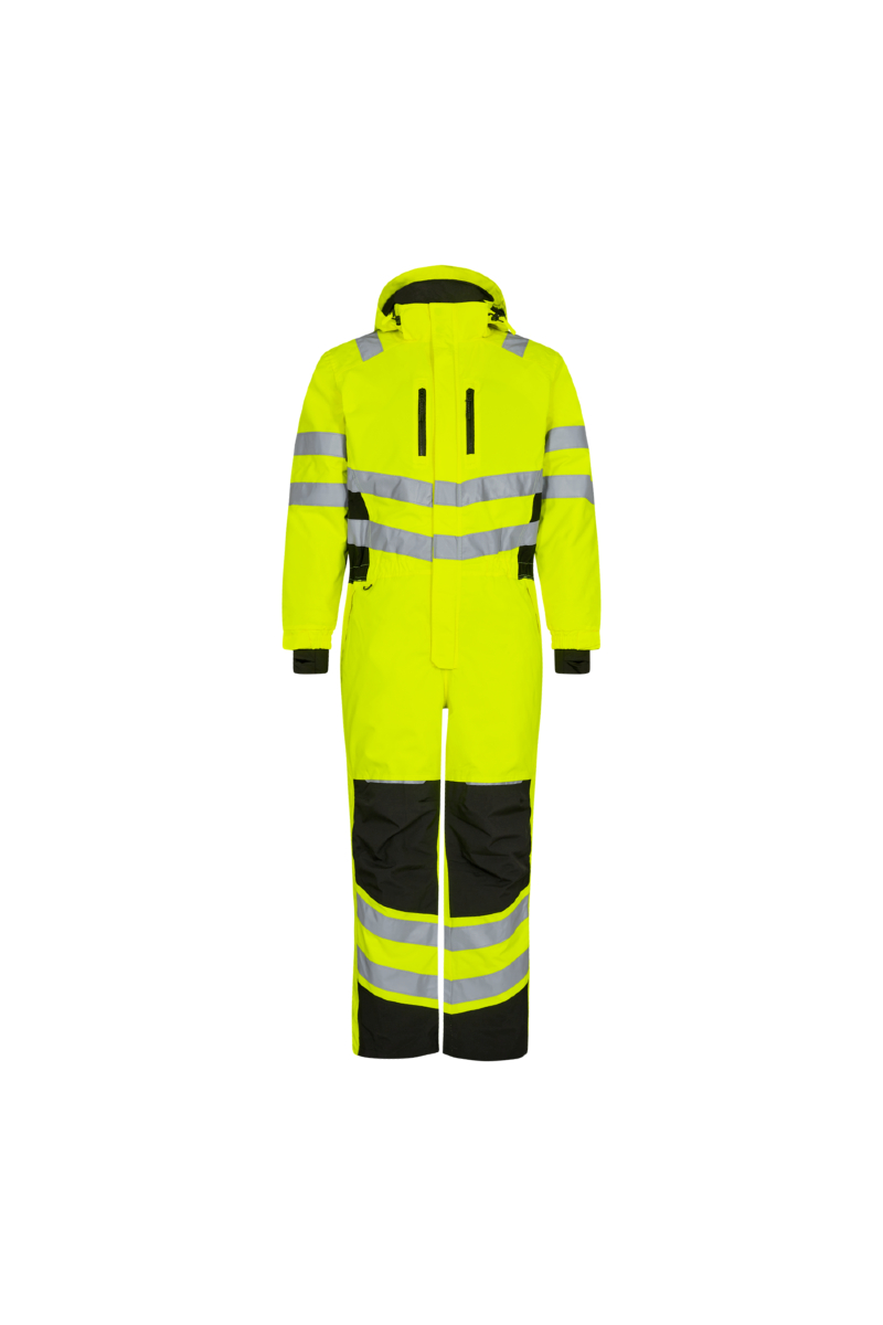 Fluorescerende pustende, vann- og vindtett vinterkjeledress med tapede sømmer og høy hals i moderne snitt. Dobbel stolpelukking med glidelås og borrelås i front. To romslige sidelommer lukket med borrelås. To brystlommer og innvendig telefonlomme, med mulighet for å trekke ledning ut gjennom en åpning, samt glidelåslukking. Avtagbar hette med plass til arbeids hjelm. Ribbedetaljer ved korsryggen som sikrer god passform og bevegelsesfrihet. Kneforsterkning. Regulerbare mansjetter ved ermer og nederst på buksebeina. Glidelås på utsiden av begge beina. Glidelås i for til trykk/broderi. Reflekser over skuldre, rundt ermer, midje og ben. Bekledningsklasse 3. Testet etter 50 ganger vask.