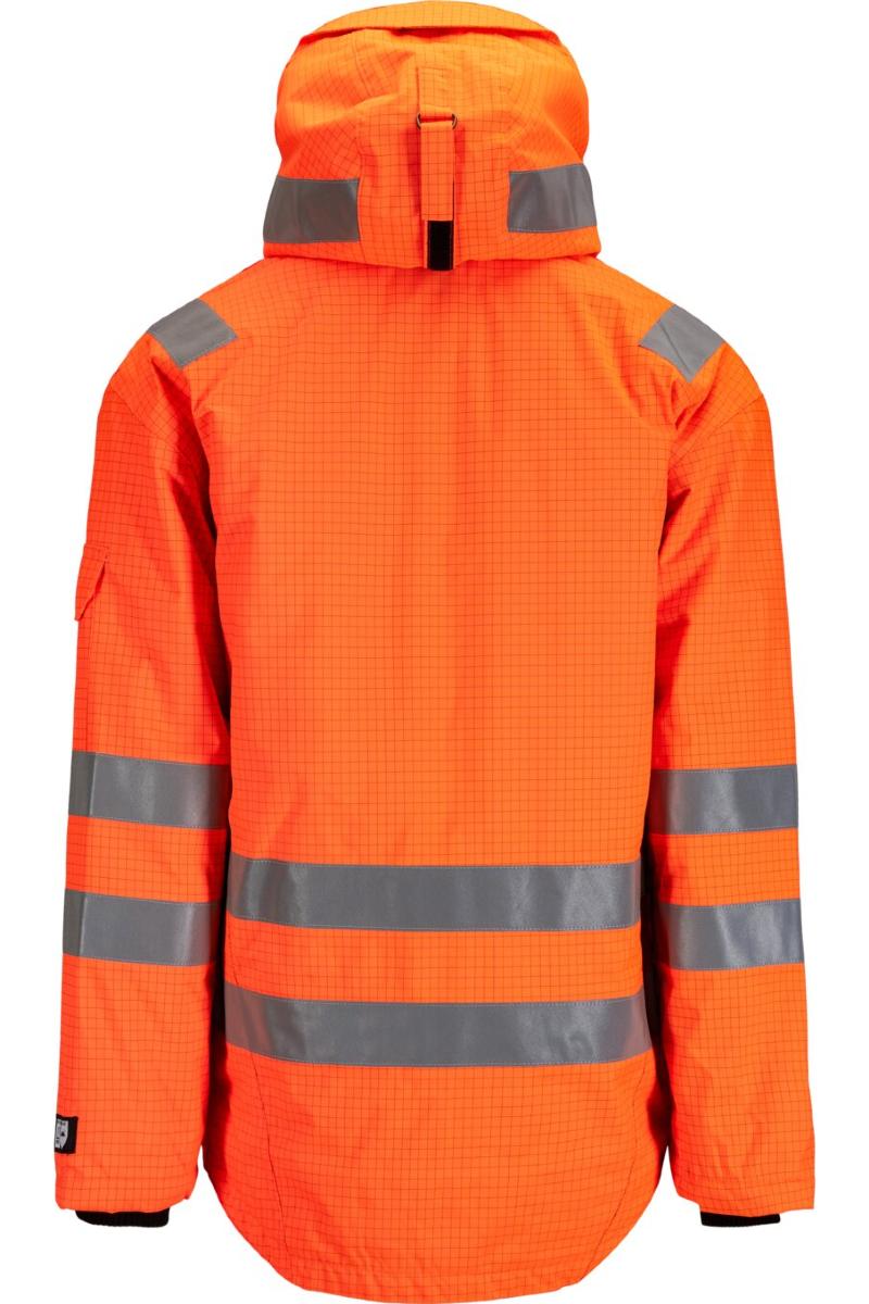 Krage med fleece på innsiden, avtakbar og justerbar hette med borrelåslukking i front, skjult glidelås under frontklaff, brystlommer med glidelås og klaff, høyre lomme med innvendig mobillomme, frontlommer med glidelås og klaff, kartlomme, innvendig lomme og ermlomme med klaff, vanntett ytterstoff med teipede sømmer, vattert for, forlenget rygg, ribbestrikket mansjett i erme og stramming i nerkant av jakke, refleks på hette, skulder, torso og erme.